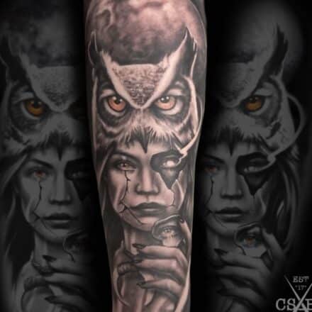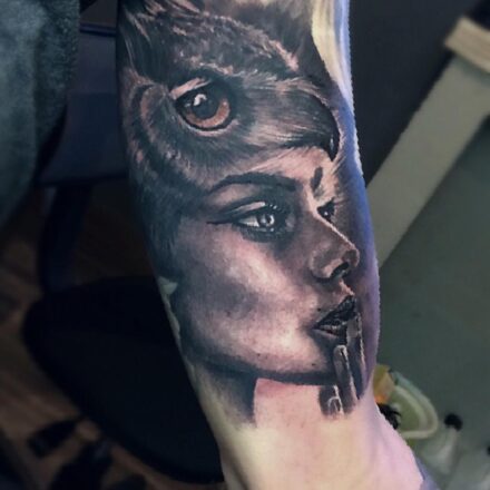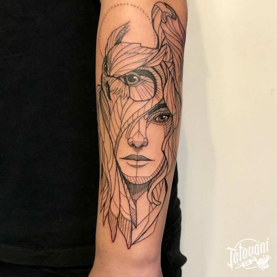 Tetování zvíře sova a žena na předloktí