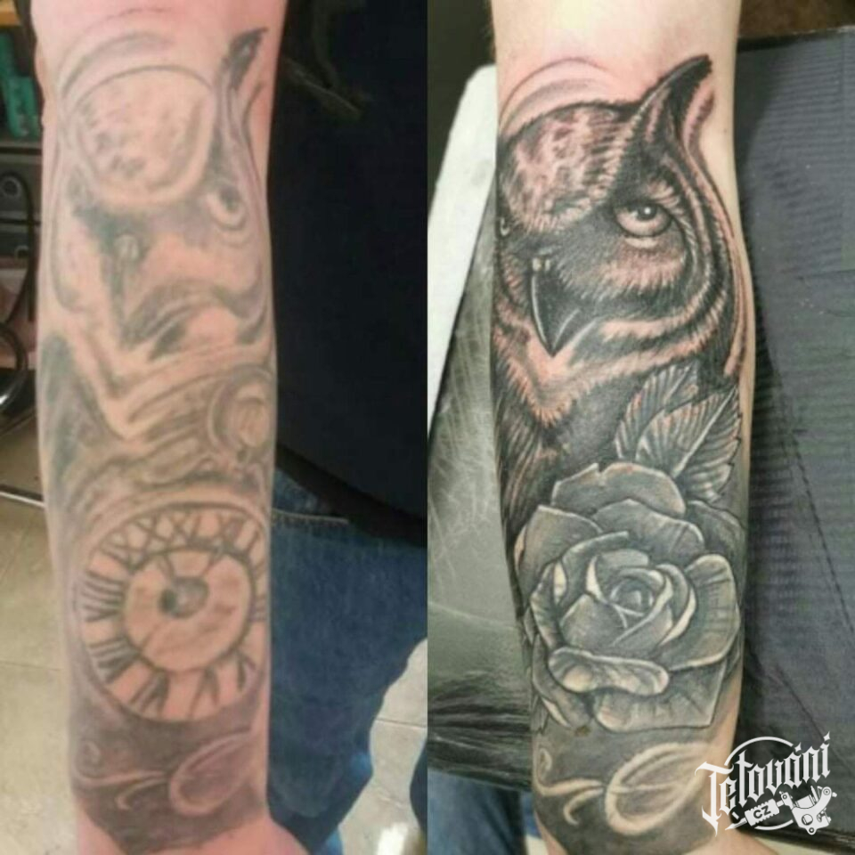 Tetování zvíře sova, květina růže na předloktí