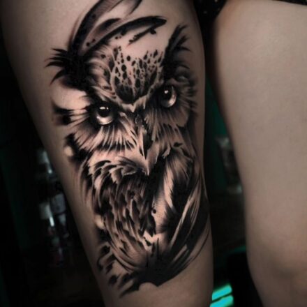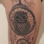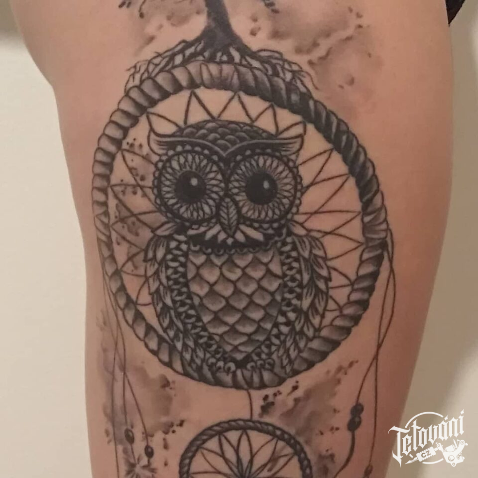 Tetování zvíře sova, lapač snů na bok stehna