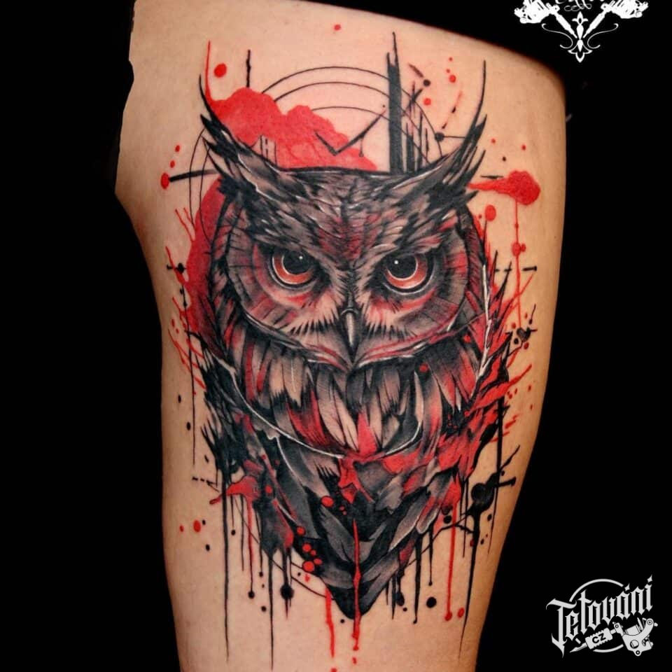 Tetování zvíře sova na bok stehna