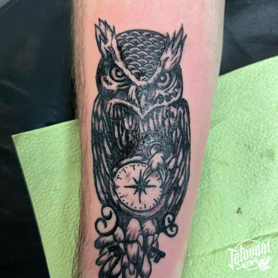 Tetování zvíře sova na předloktí