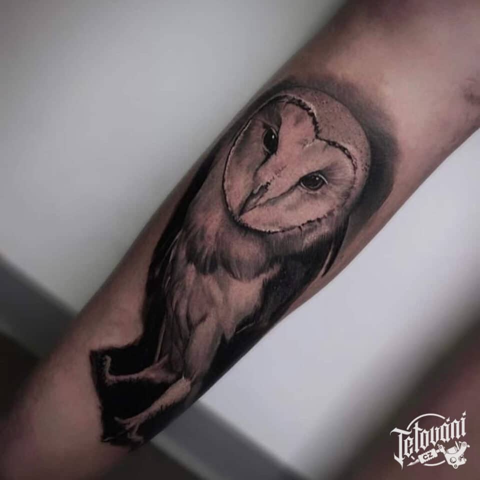 Tetování zvíře, sova na předloktí