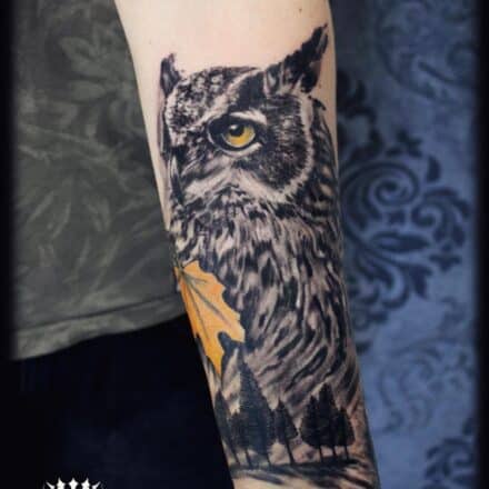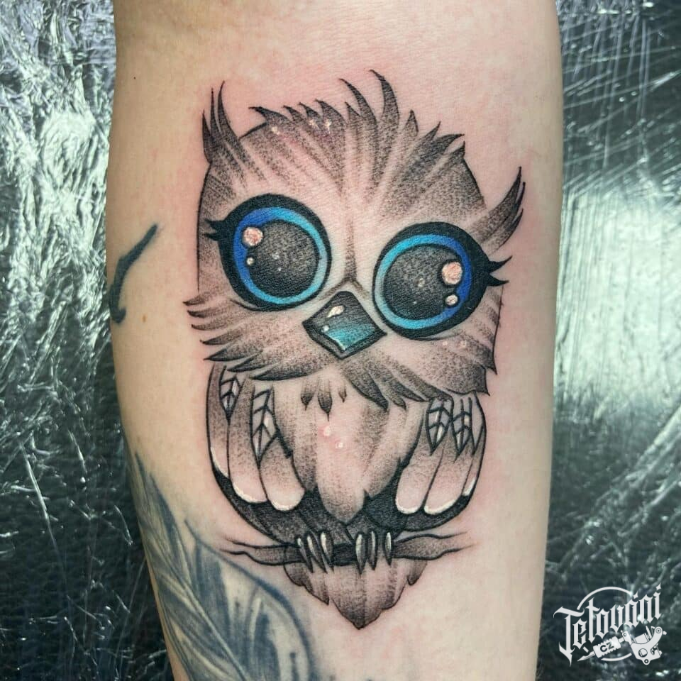 Tetování zvíře, sova na předloktí