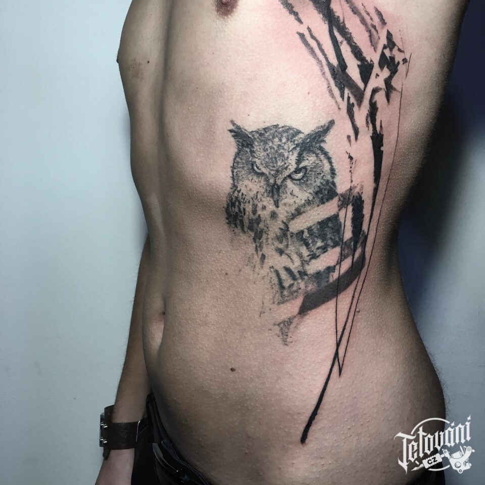 Tetování zvíře sova na žebra