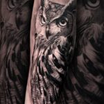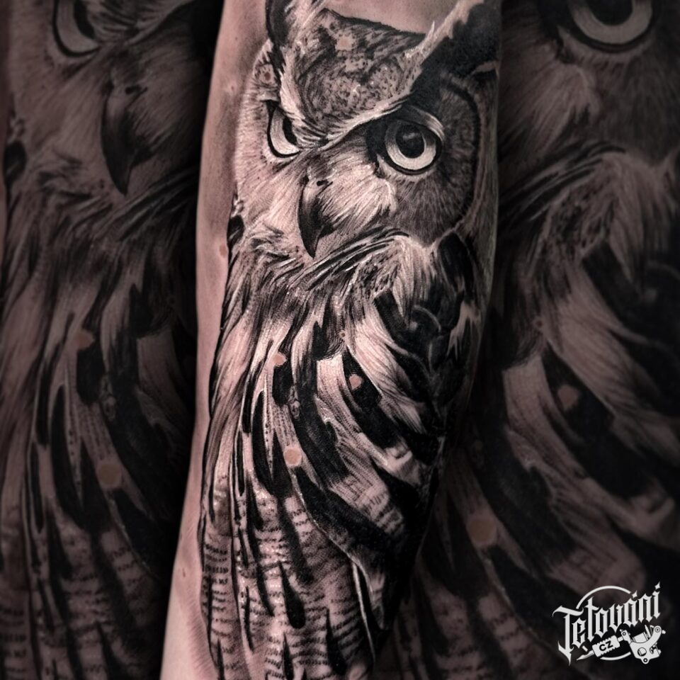 Tetování zvíře sova, portrét na předloktí
