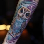 Tetování zvíře sova, portrét na předloktí