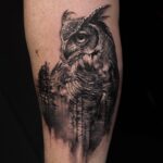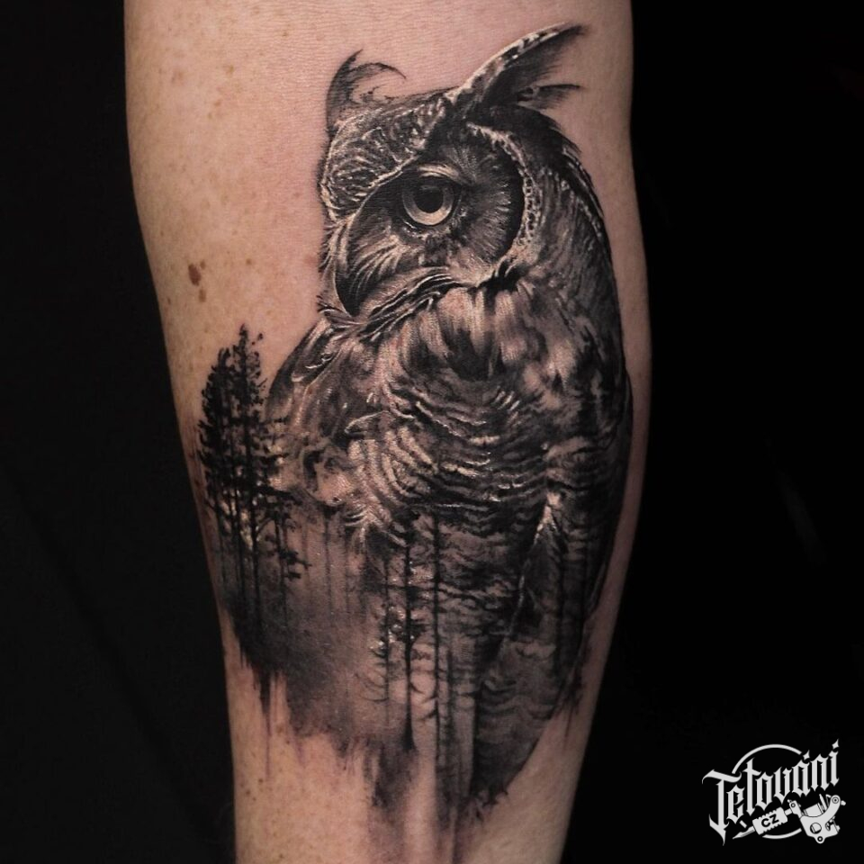 Tetování zvíře sova, portrét, příroda, les na předloktí