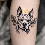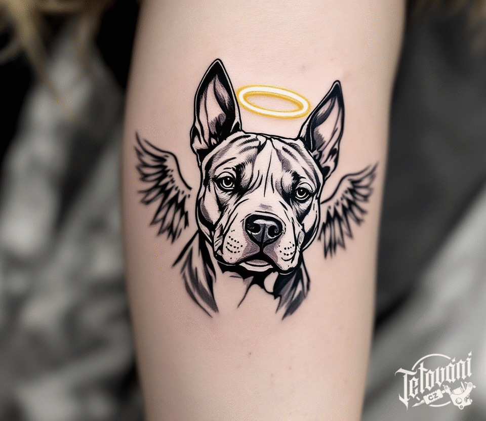 Tetování zvíře staffbul, pes se svatozáří a křídly na rameno