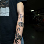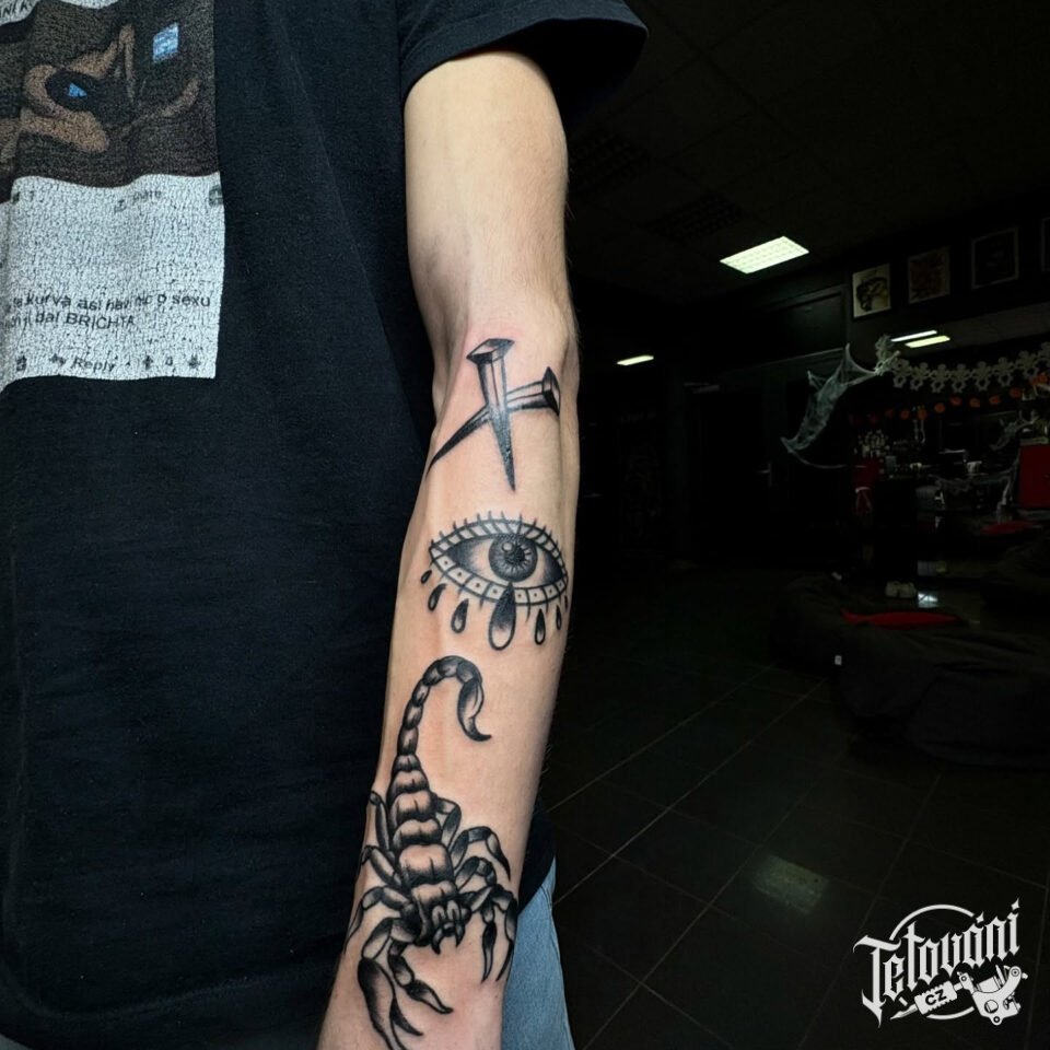 Tetování zvíře štír, štír znamení zvěrokruhu a oko na předloktí