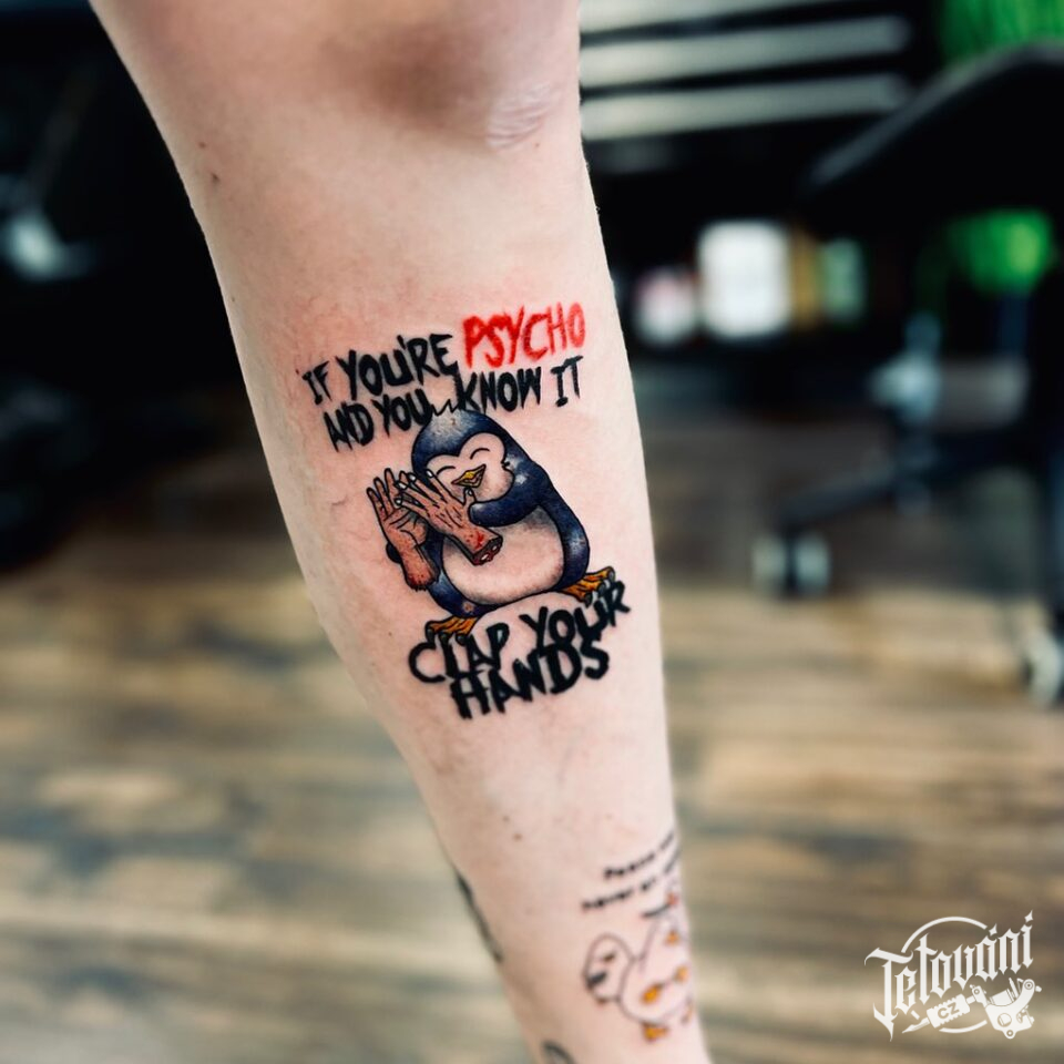 Tetování zvíře tučňák, postavička, nápisy na holeň