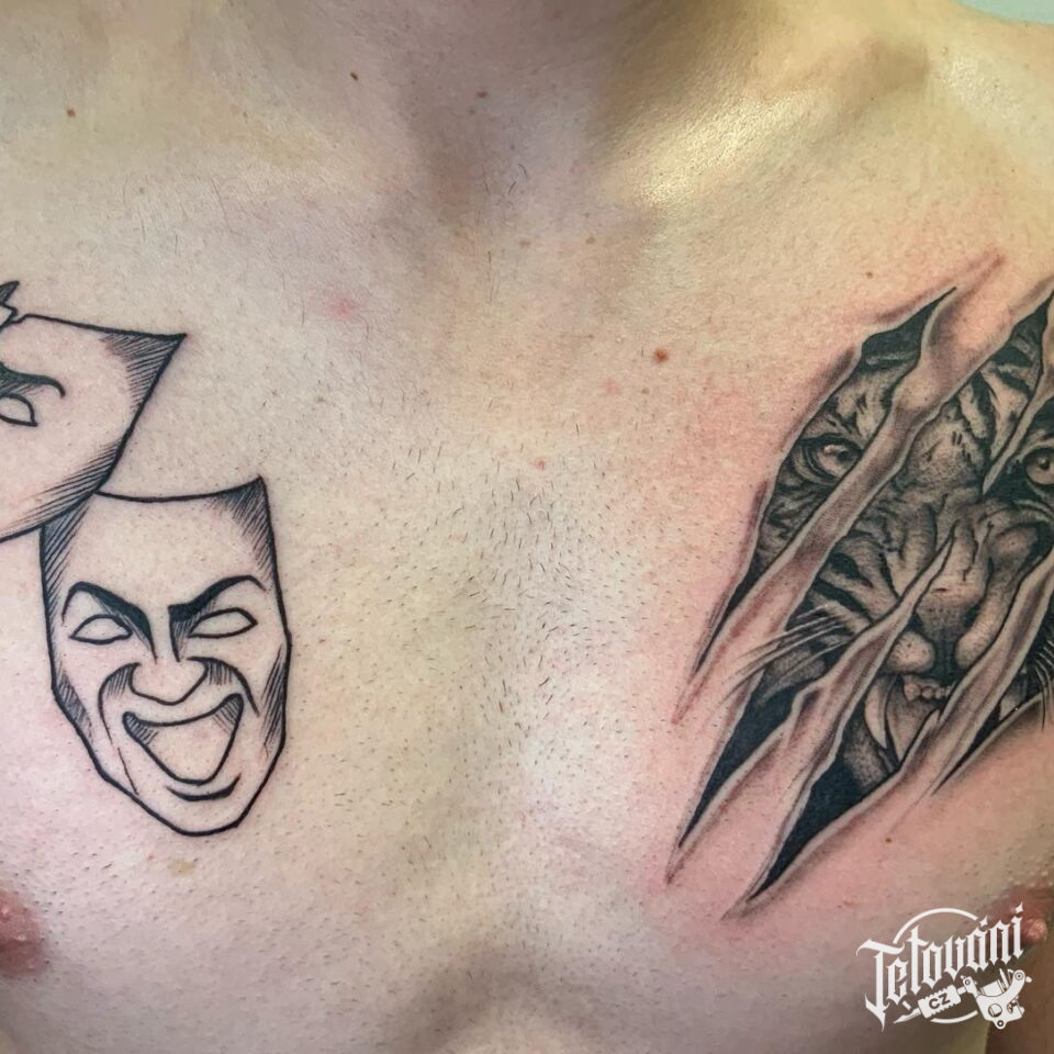 Tetování zvíře, tygr a divadelní masky na hrudi