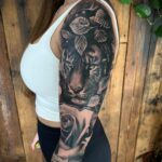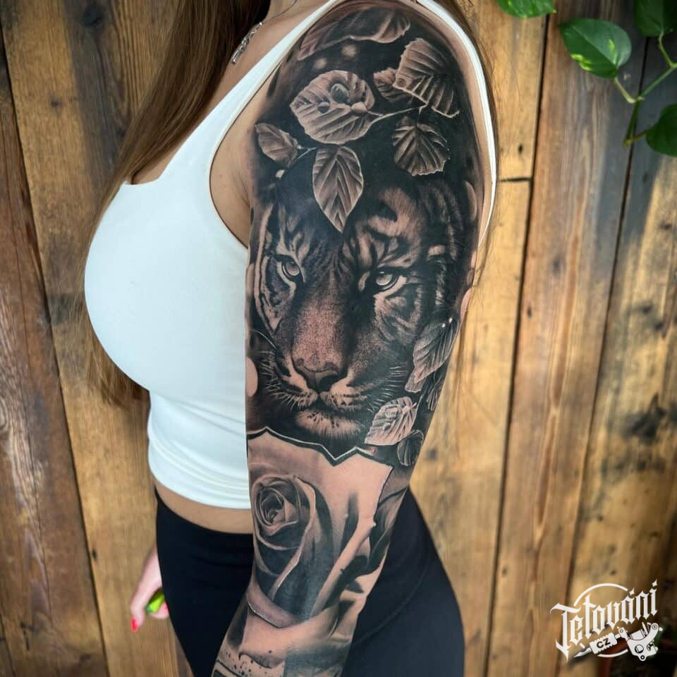 Tetování zvíře tygr, květiny růže na rameno