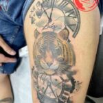 Tetování zvíře, tygr, narození dítěte a hodiny na stehně