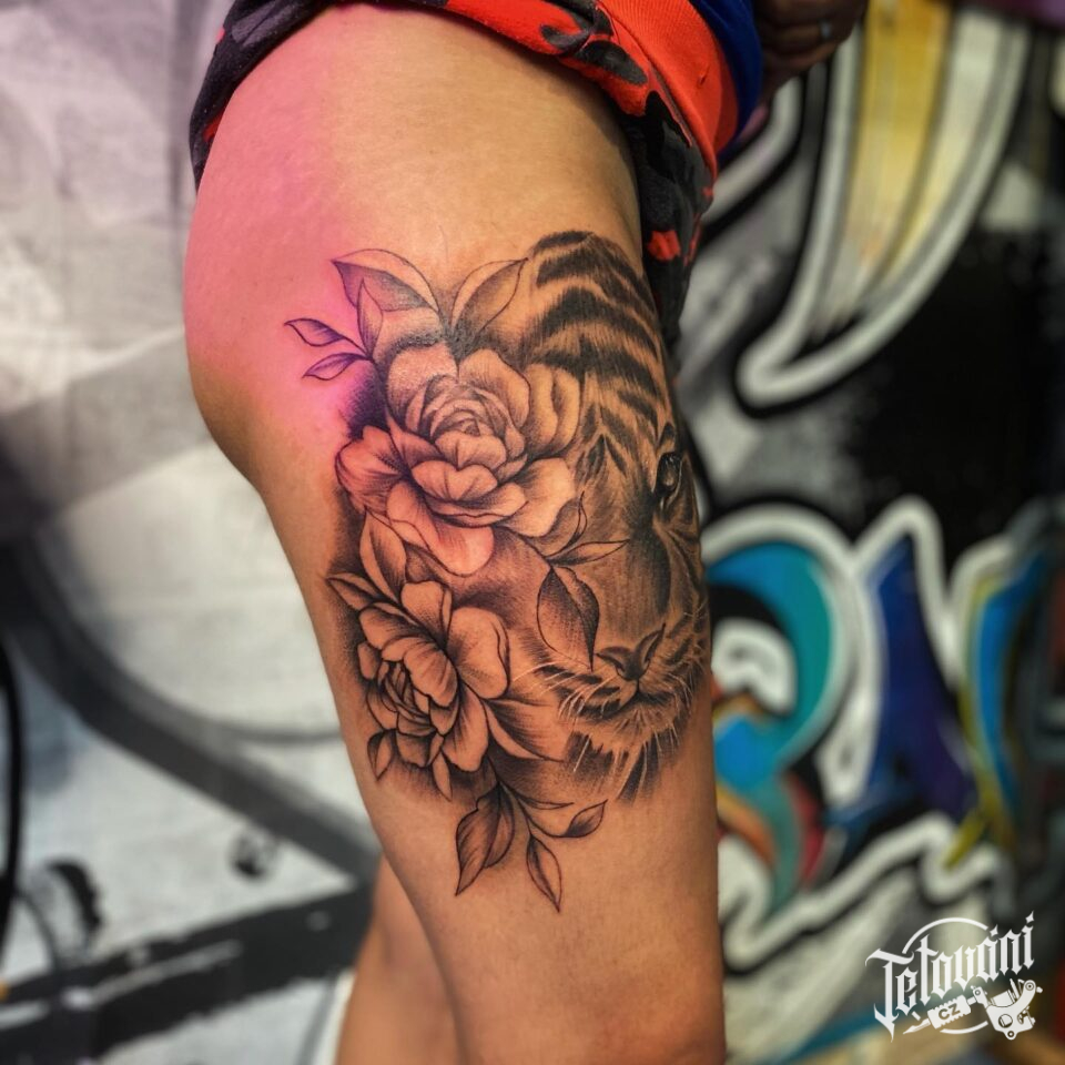 Tetování zvíře tygr, pivoňky, květiny na stehno