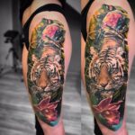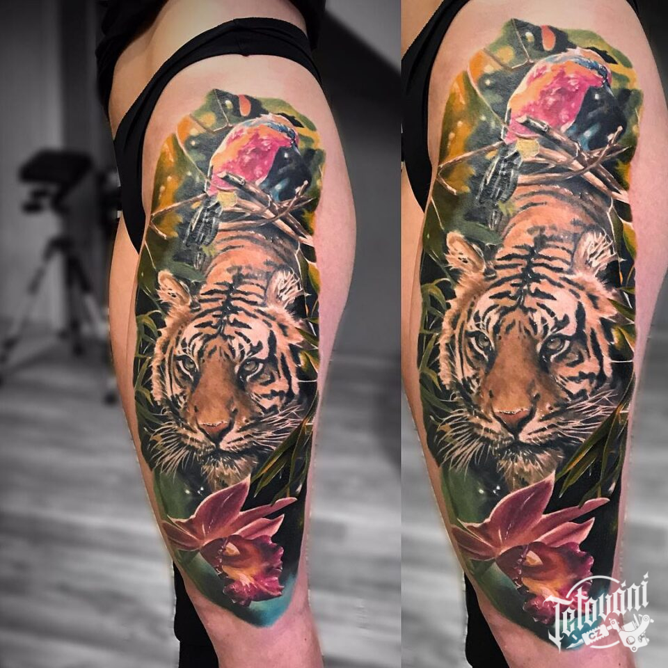 Tetování zvíře tygr, příroda, květiny na bok stehna
