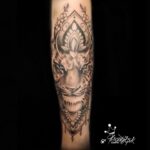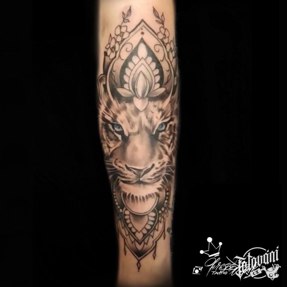 Tetování zvíře, tygr s mandalou na předloktí