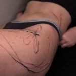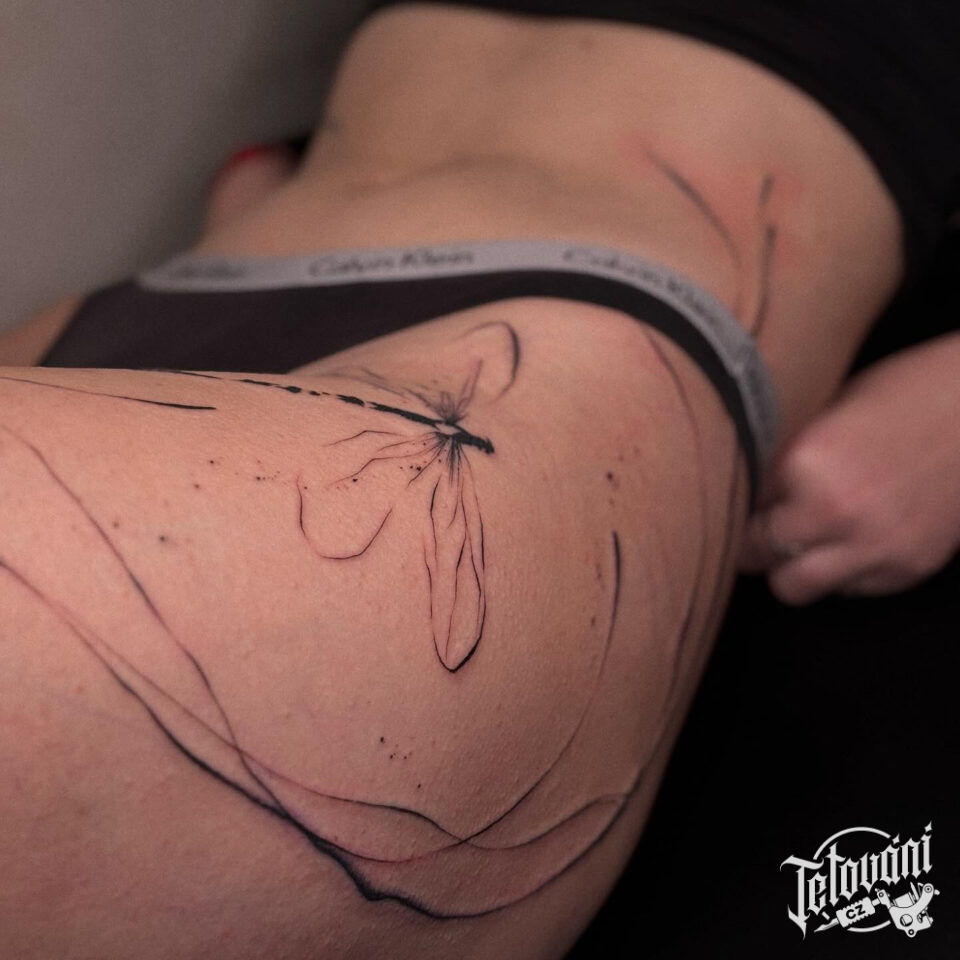 Tetování zvíře, vážka a čáry na boku stehna