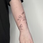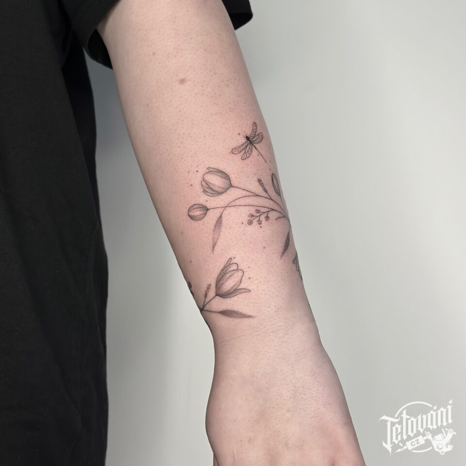 Tetování zvíře, vážka a luční kvítí na předloktí