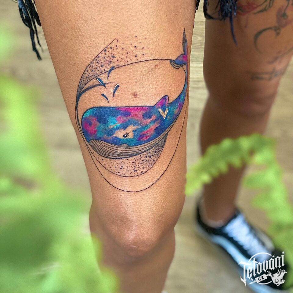 Tetování zvíře, velryba na stehně