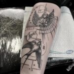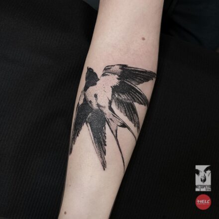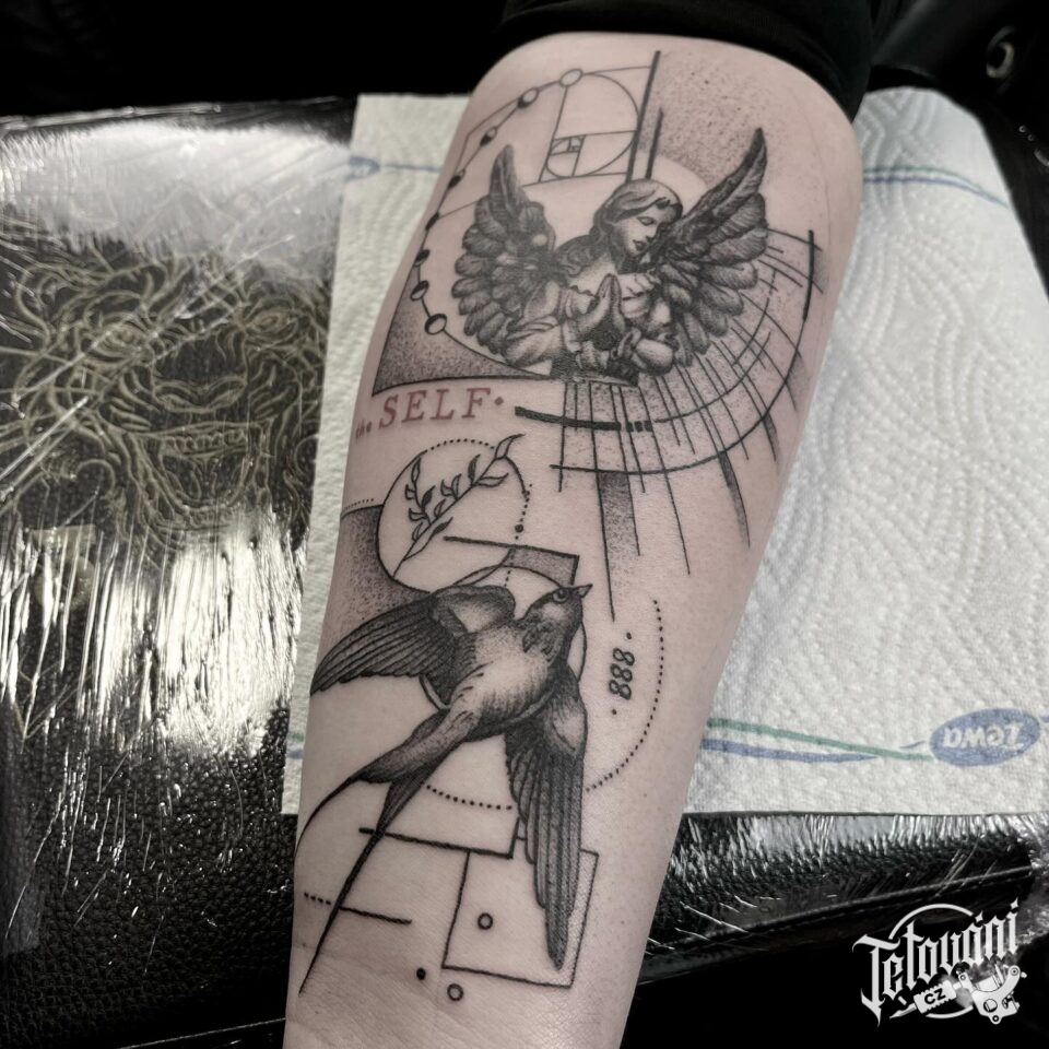 Tetování zvíře, vlaštovka, anděl, nápisy na předloktí