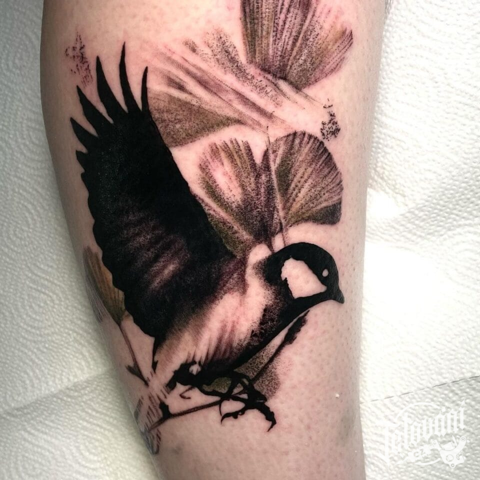 Tetování zvíře vlaštovka s květy na lýtko