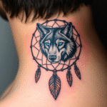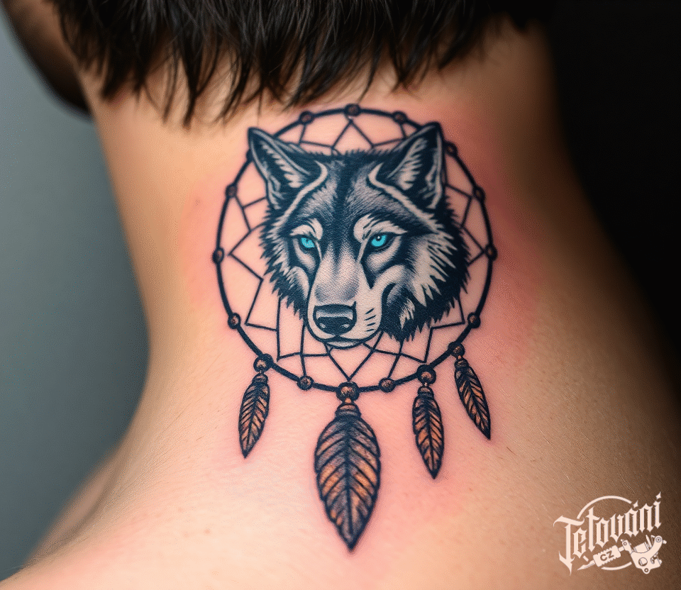 Tetování zvíře vlk a lapač snu na krk