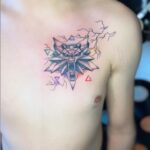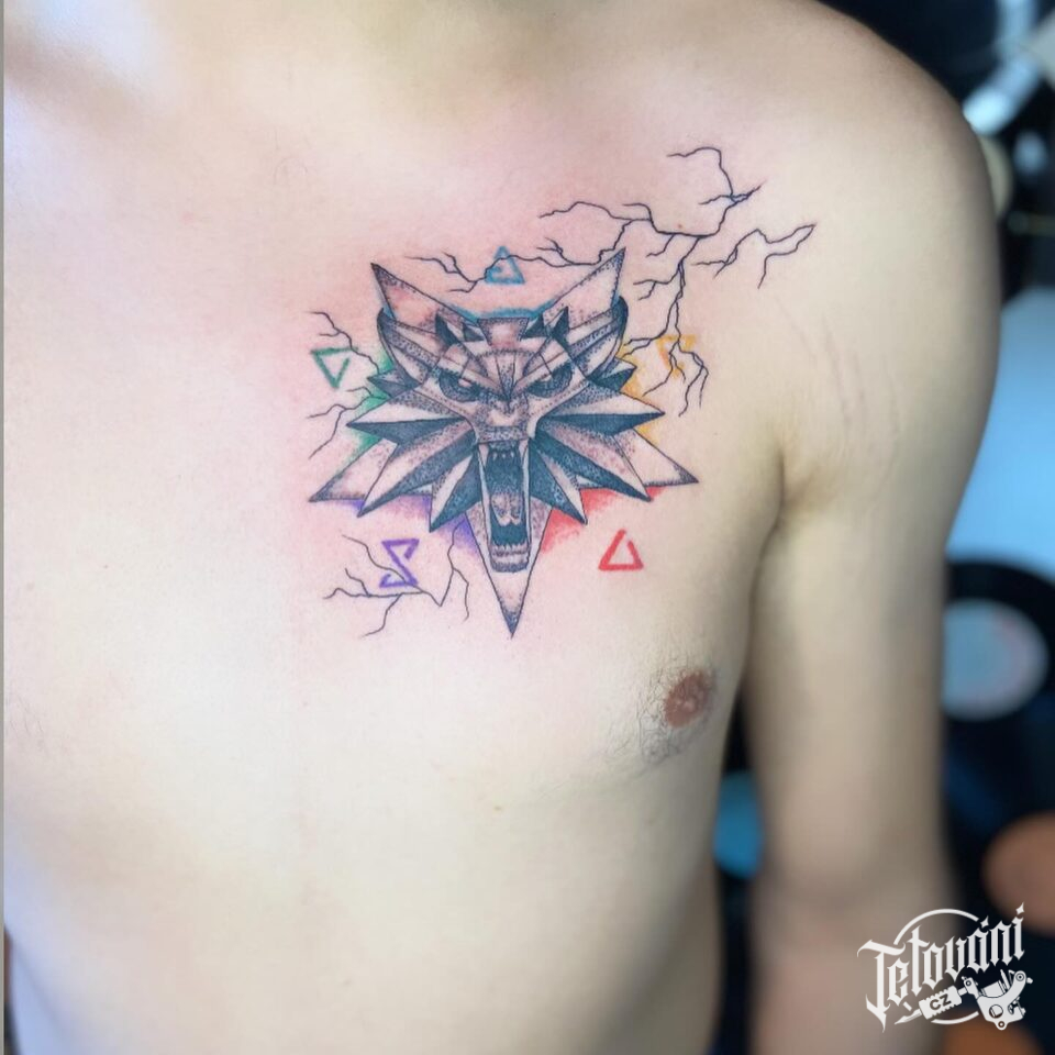 Tetování zvíře, vlk a znaky a symboly na hrudi