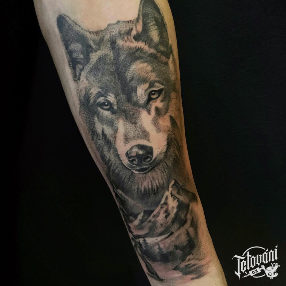 Tetování zvíře vlk, hlava vlka na předloktí