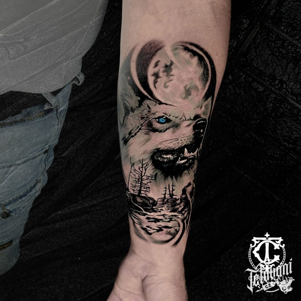 Tetování zvíře, vlk na předloktí