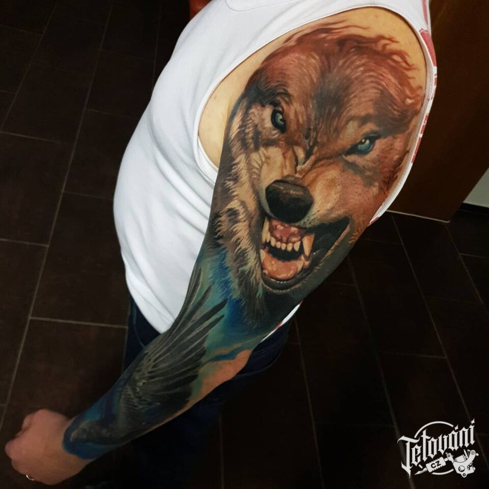 Tetování zvíře vlk, portréty, křídla, rukáv