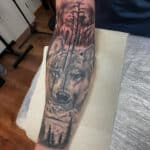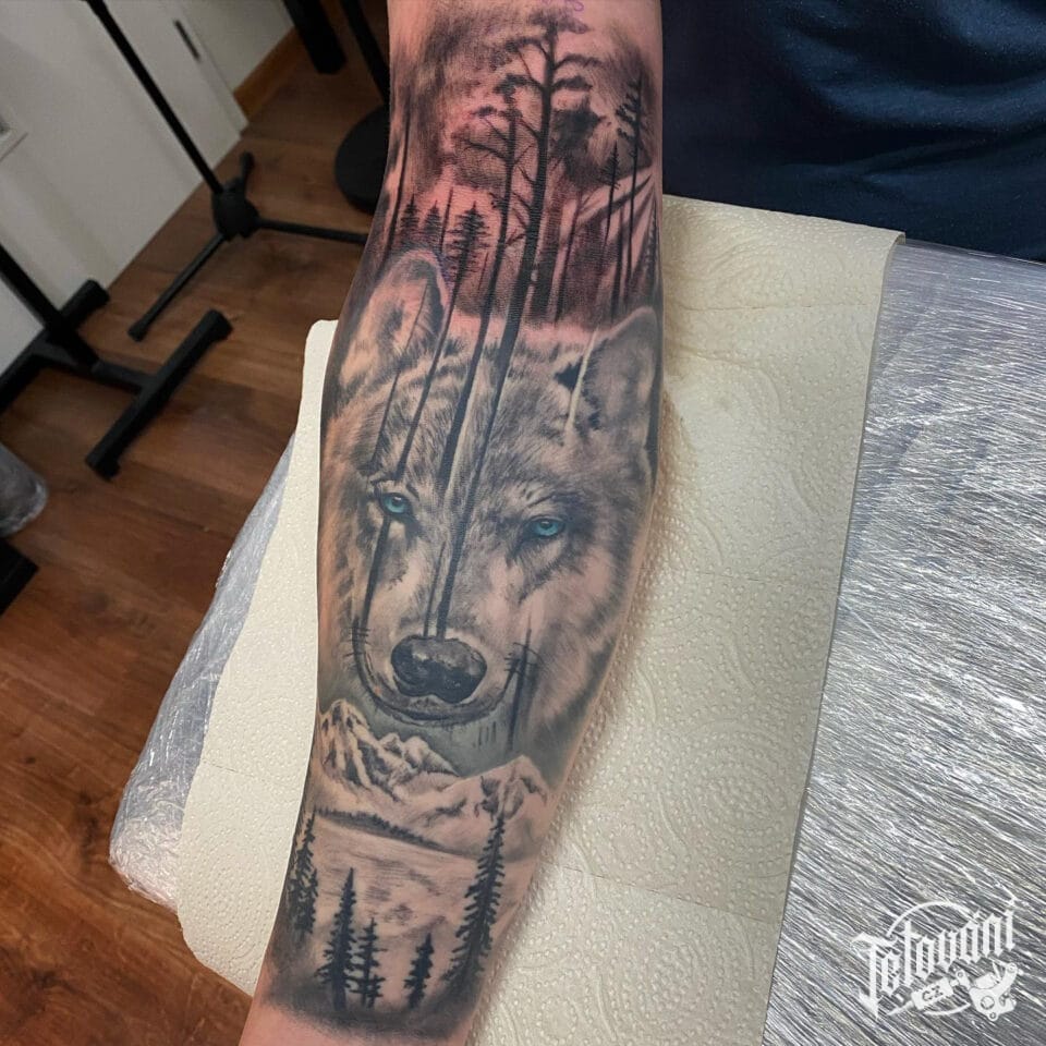 Tetování zvíře vlk, příroda les, hory na předloktí