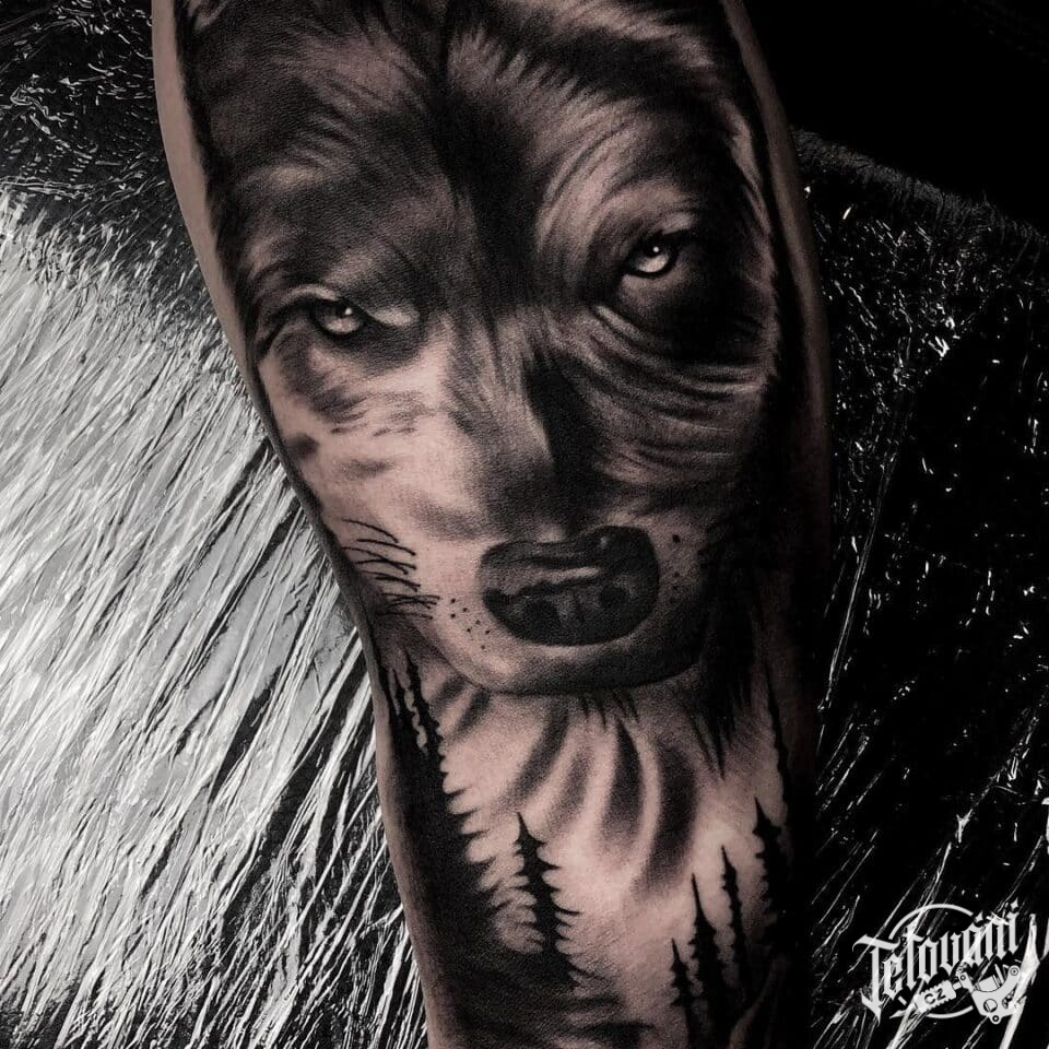 Tetování zvíře vlk, příroda les na předloktí
