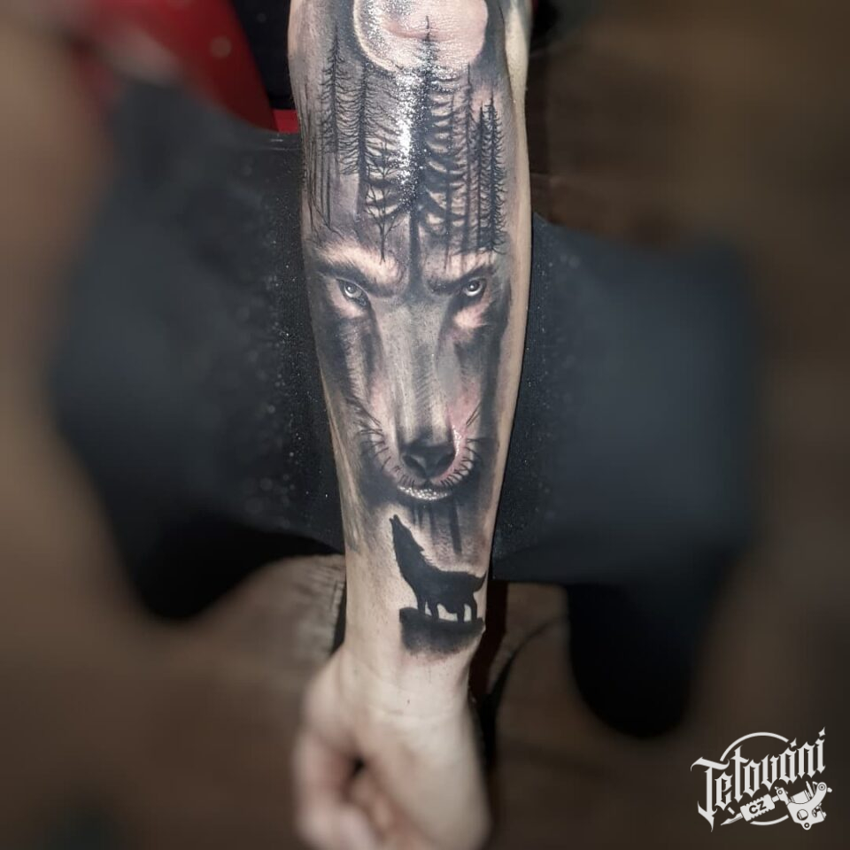 Tetování zvíře vlk, příroda les na předloktí