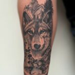 Tetování zvíře vlk s přírodou, hory a les na předloktí