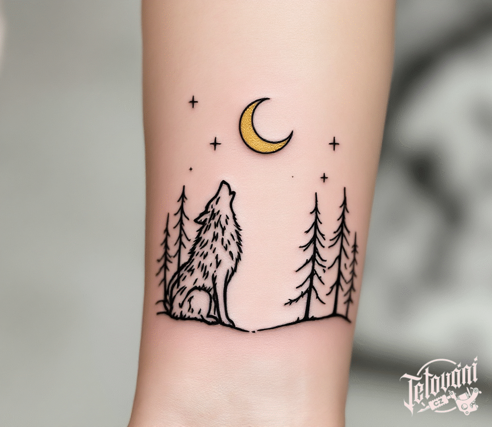 Tetování zvíře, vlk v lese a Měsíc na předloktí