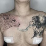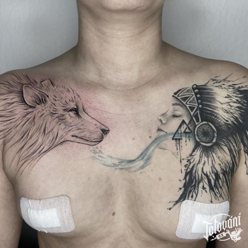 Tetování zvíře vlk, žena indiánka na hrudník