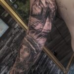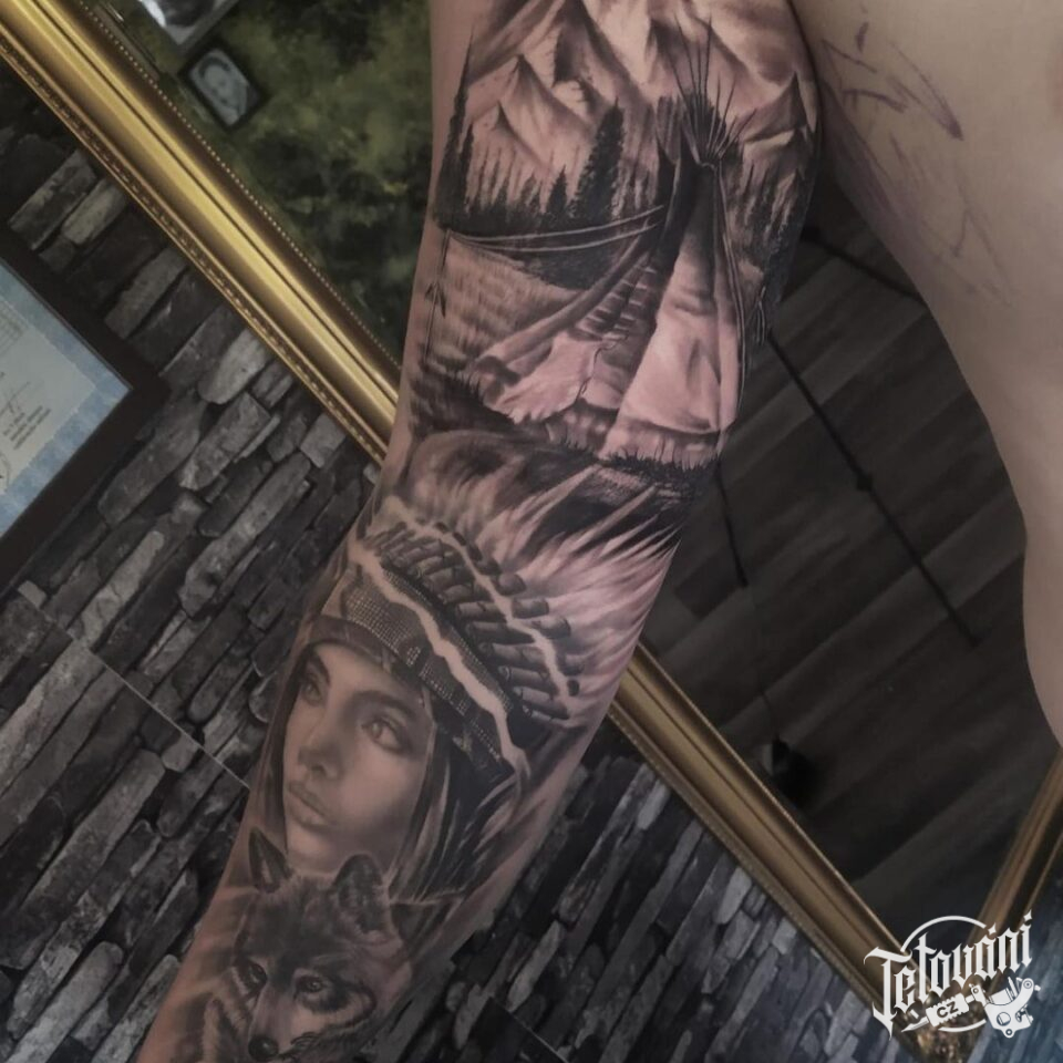 Tetování zvíře vlk, žena indiánka, příroda, hory na paži a předloktí