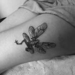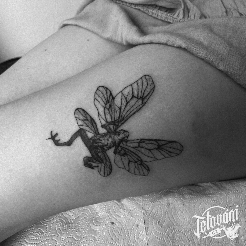 Tetování zvíře žába s křídly na stehno