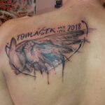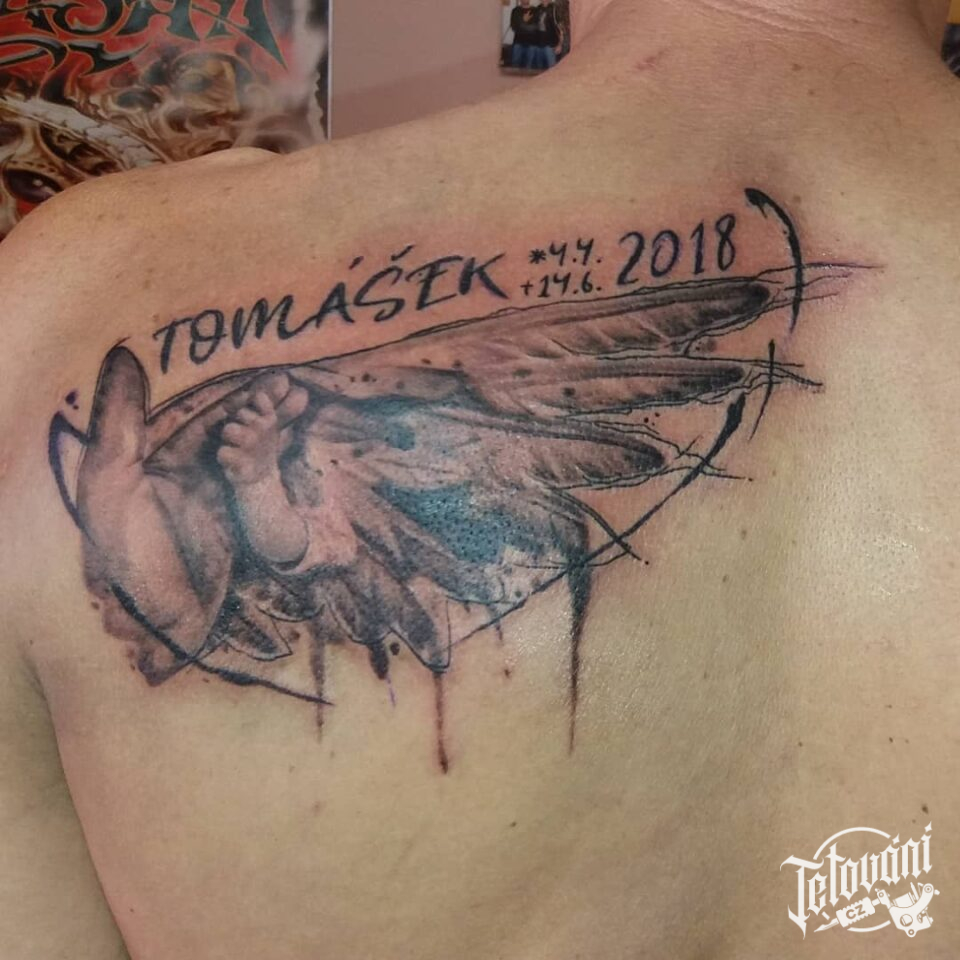 Vzpomínkové tetování, jméno, datum, křídlo na zádech