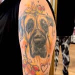 Vzpomínkové tetování, portrét pes, zvíře, květiny na rameno