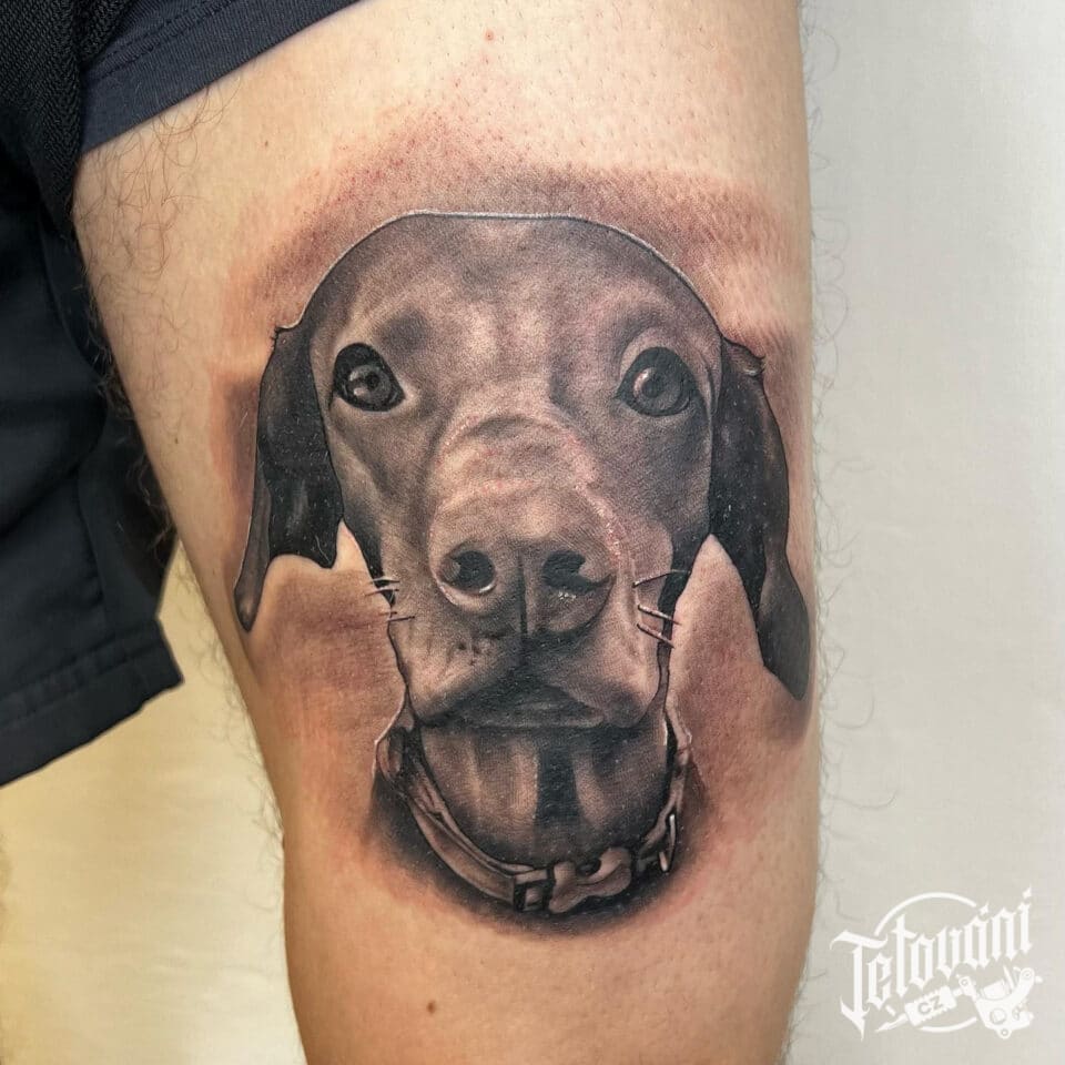 Vzpomínkové tetování, portrét pes, zvíře na stehno
