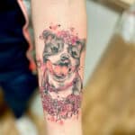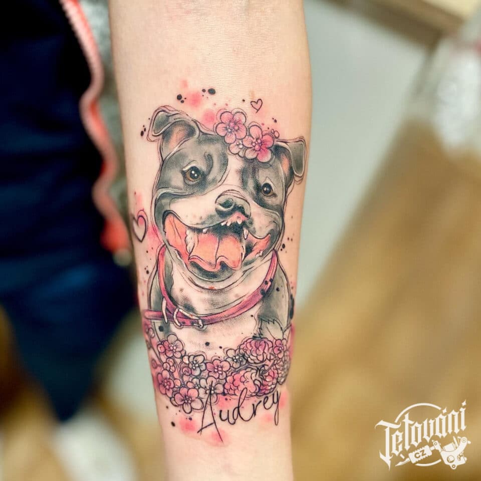 Vzpomínkové tetování, portrét pes, zvíře se jménem, květiny na předloktí