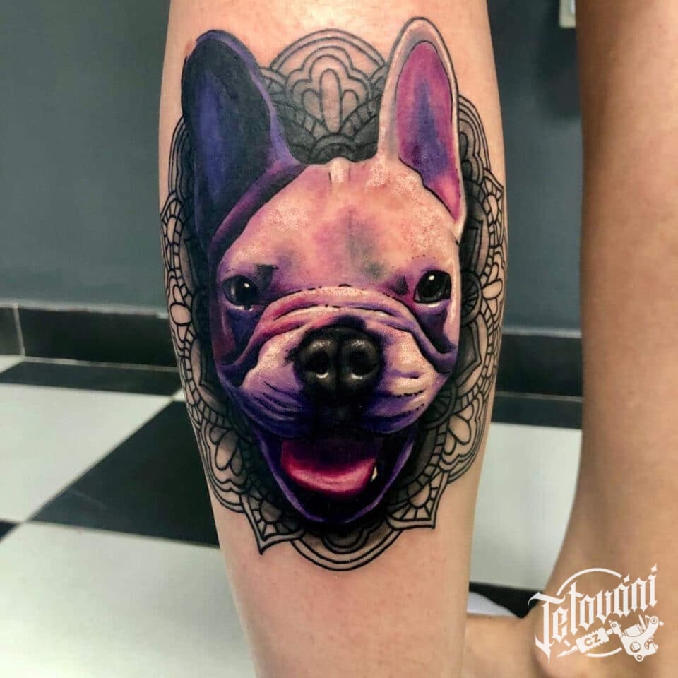 Vzpomínkové tetování portrét psa s mandalou, portrét, zvíře na lýtko
