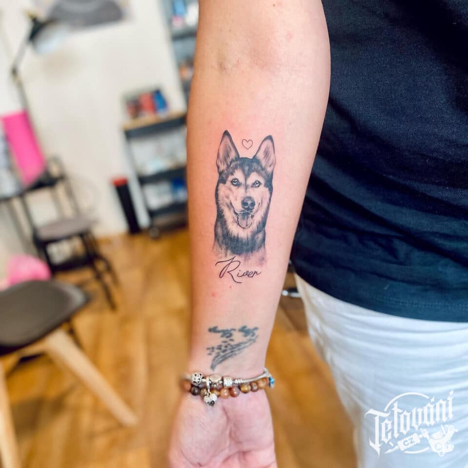Vzpomínkové tetování portrét psa se jménem, zvíře na předloktí