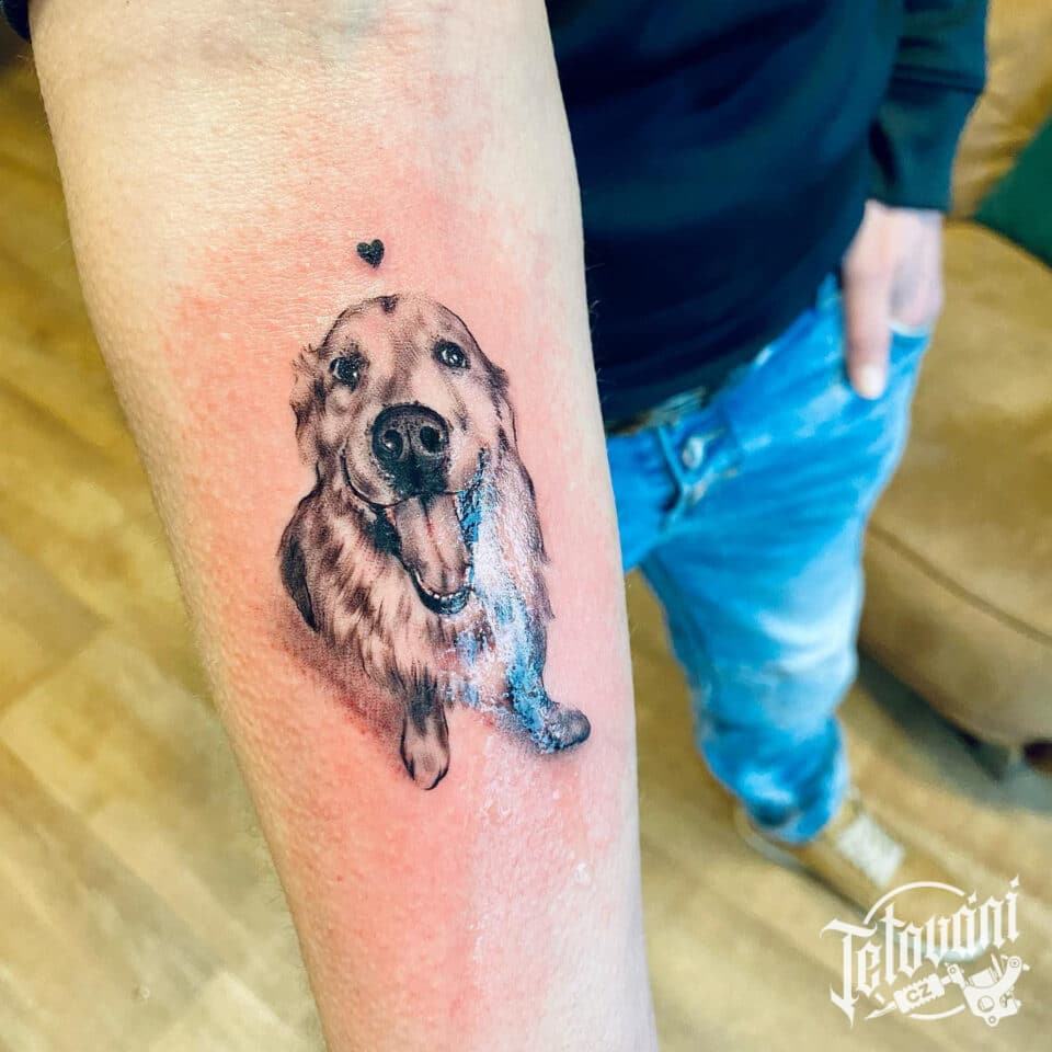 Vzpomínkové tetování portrét psa, zvíře a srdce na předloktí