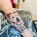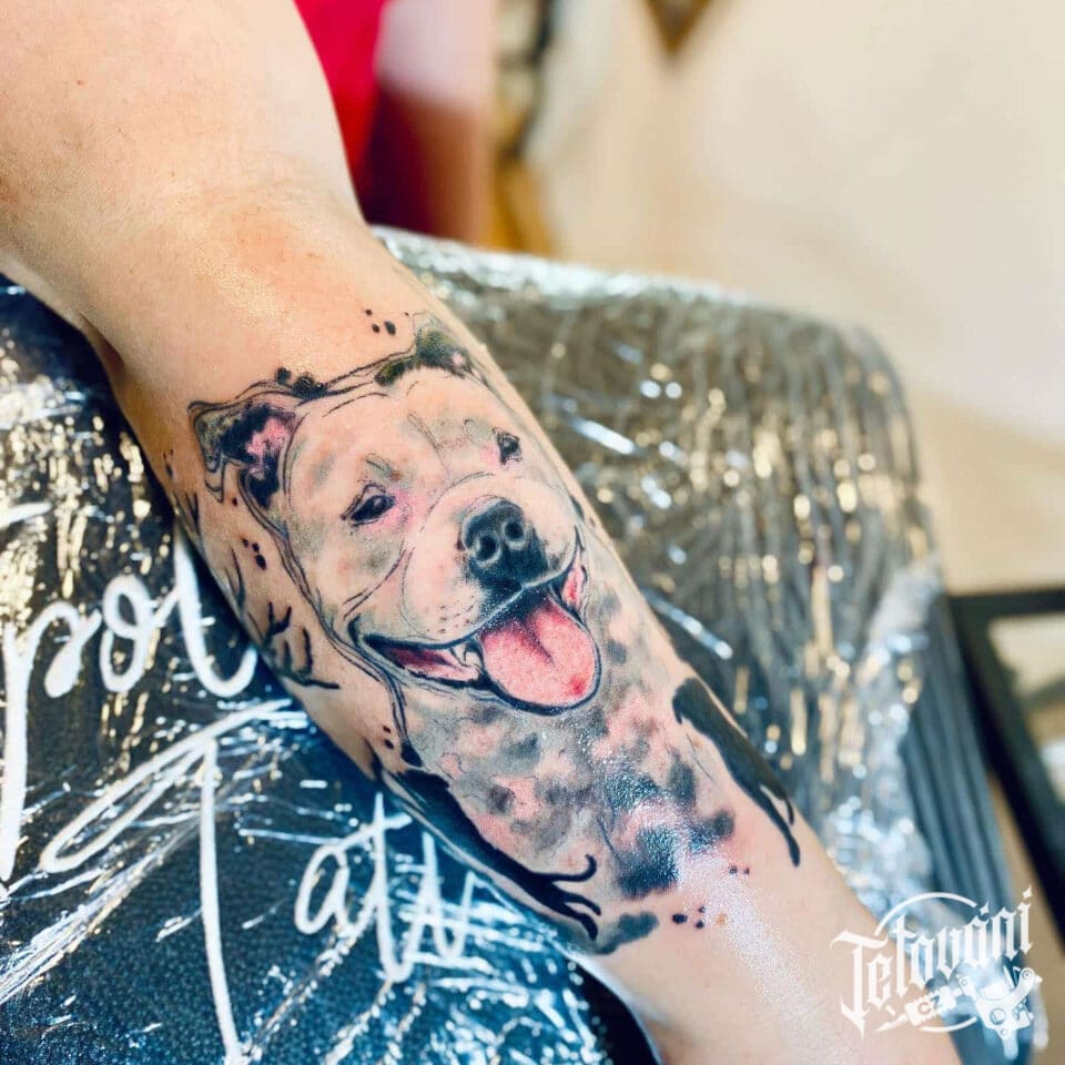 Vzpomínkové tetování portrét psa, zvíře na lýtko