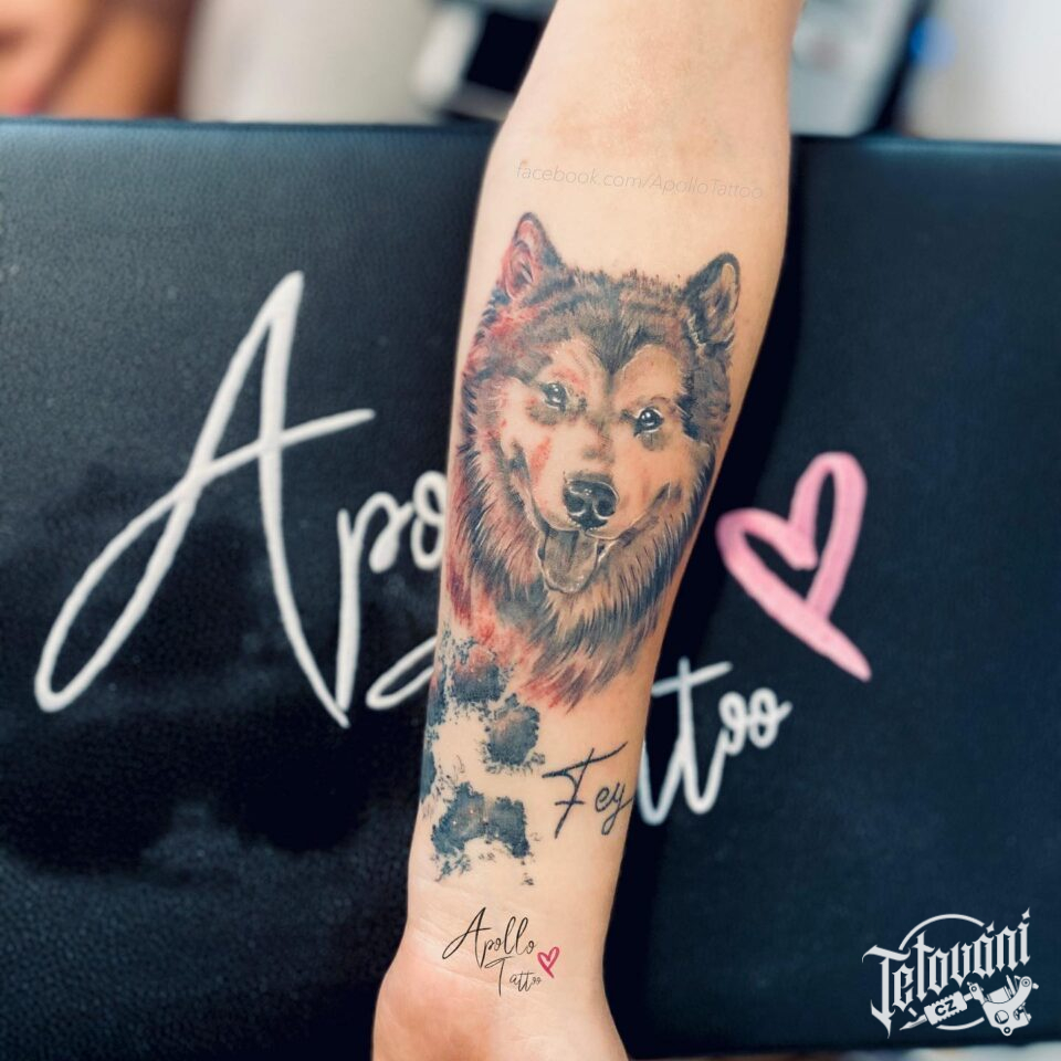 Vzpomínkové tetování portrét psa, zvíře se jménem na předloktí