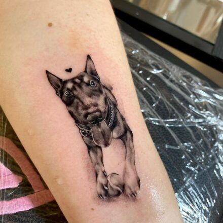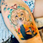 Vzpomínkové tetování portrét psa, zvíře, srdce na stehno