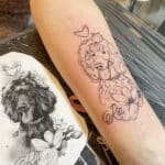 Vzpomínkové tetování portrét psa, zvíře, srdce se jménem na předloktí
