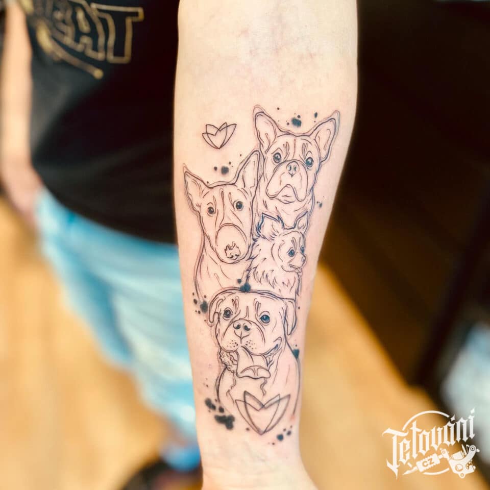 Vzpomínkové tetování portréty psů se srdcem na předloktí